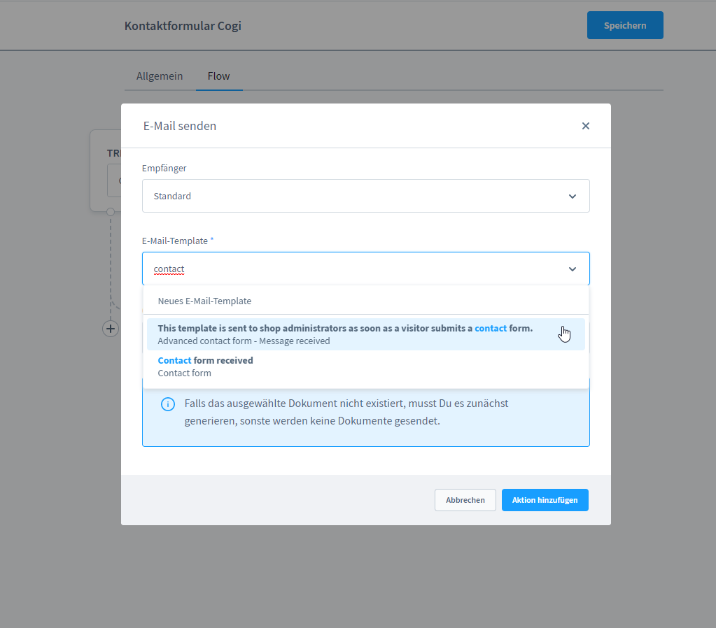 Nach der gewöhnlichen Installation der Erweiterung müssen Sie einen eigenen Flow mit dem Flow-Builder in Shopware erstellen. Achten Sie in dem Reiter "Allgemein" darauf, den Flow zu aktivieren. Wählen Sie nun in dem Reiter "Flow" das Event "Codegiganten / Contact Form / Submit" aus und erstellen Sie eine Aktion. Verwenden Sie die Aktion "E-Mail senden" und wählen Sie das E-Mail-Template der App aus, welches Sie mit dem Suchbegriff "Contact" einfach finden können.